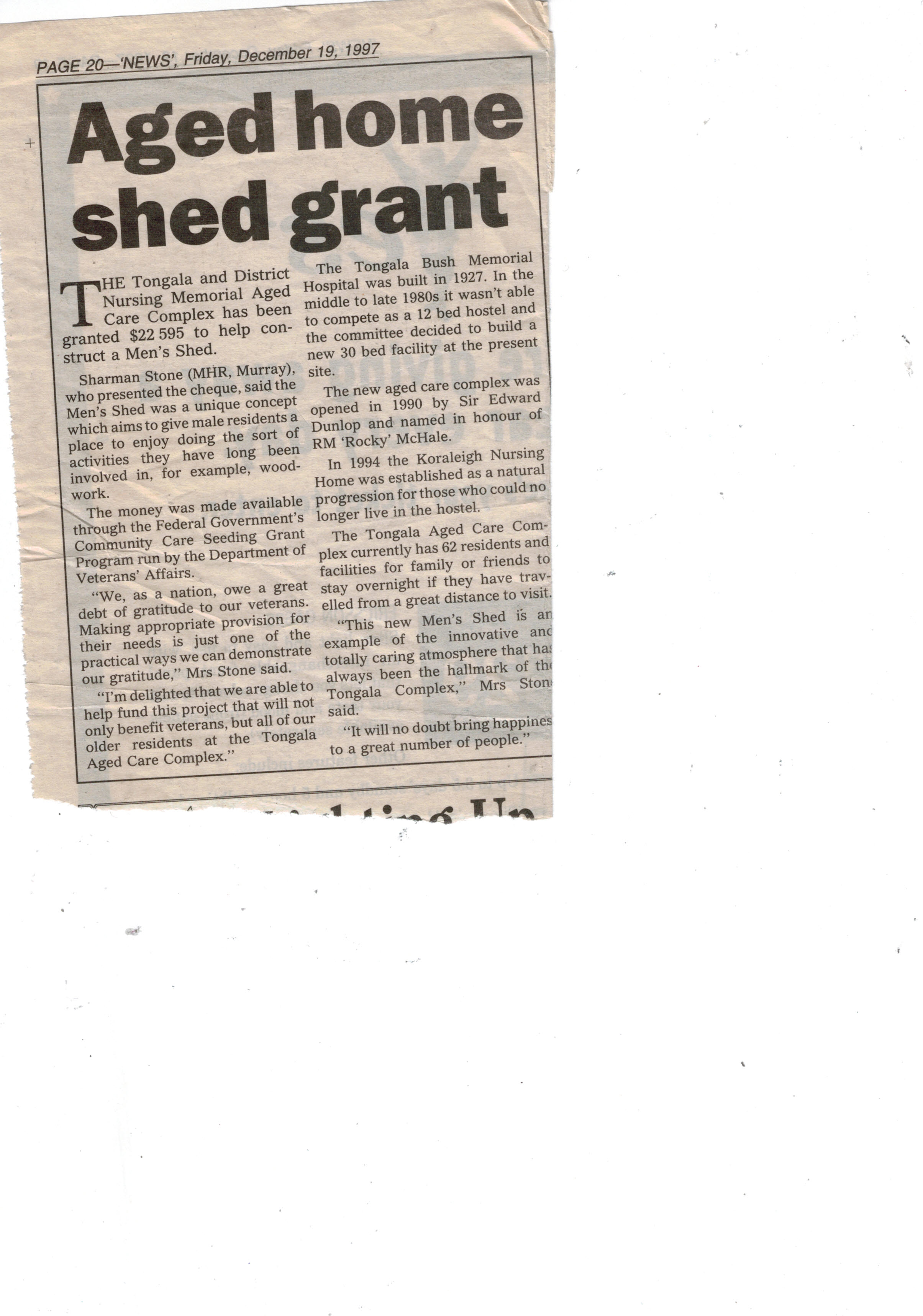 Below is a press cutting from December 1997 confirming receipt of a grant from the Department of Veterans Affairs to establish a Men’s Shed in Tongala.