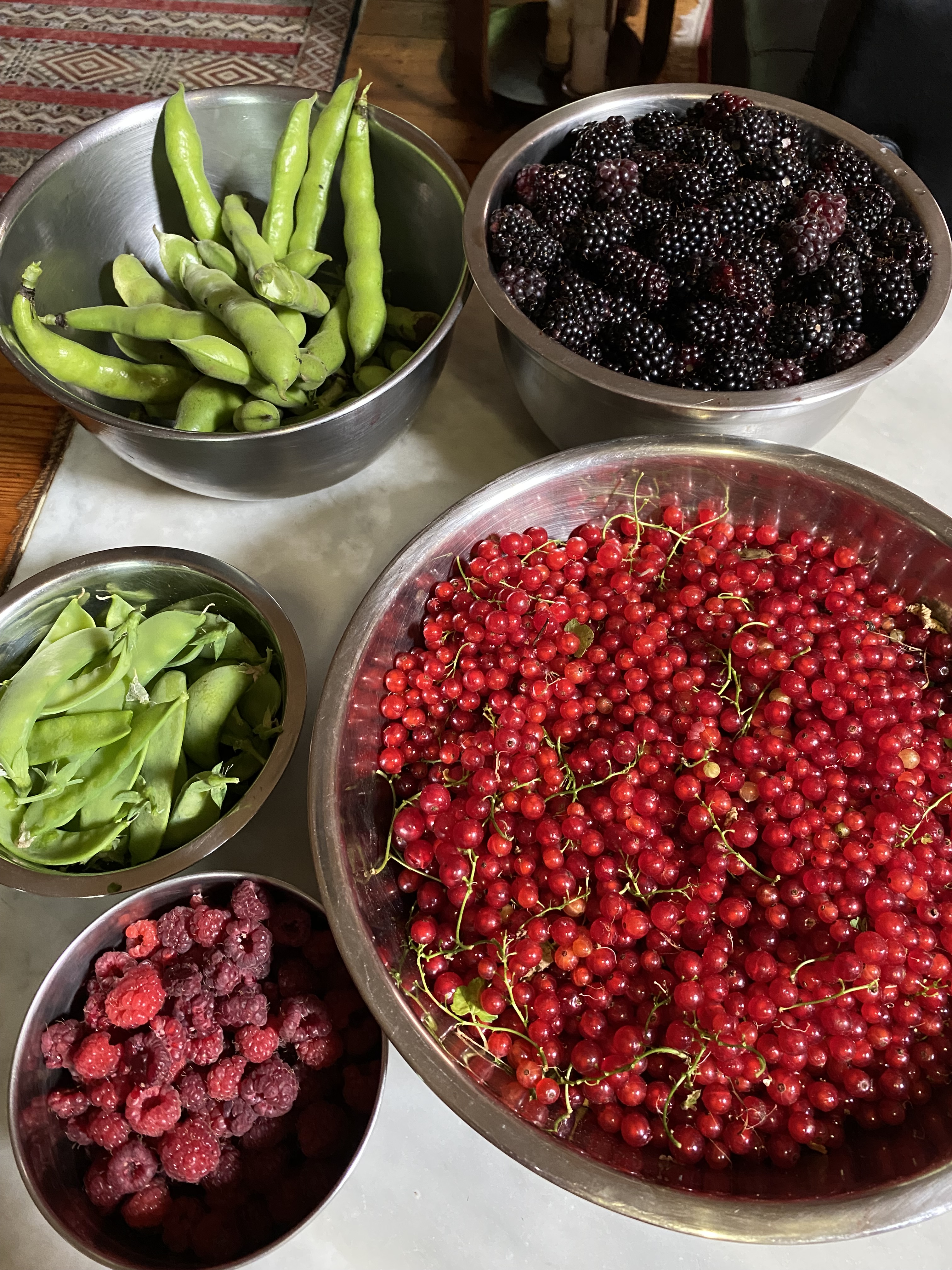One day Kingston home garden pick, Christmas 2023: broad beans, snow peas, raspberries, red currants & boysenberries.