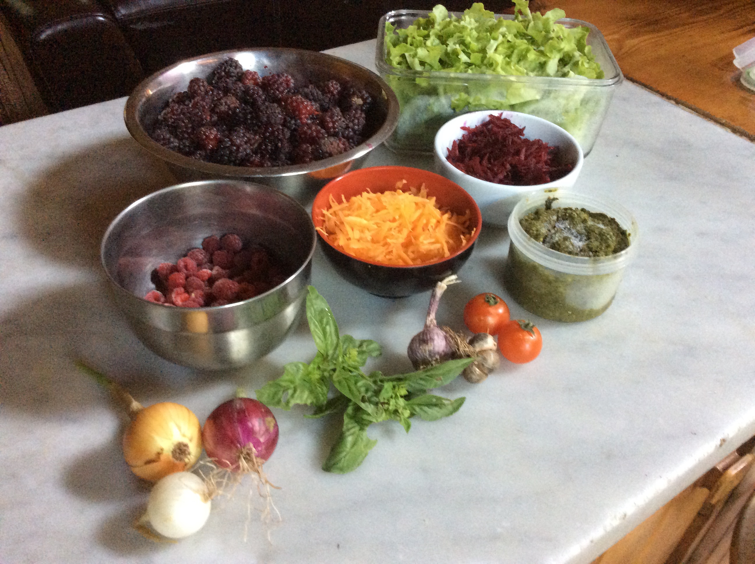 One day Kingston home garden pick, Christmas 2023: broad beans, snow peas, raspberries, red currants & boysenberries.